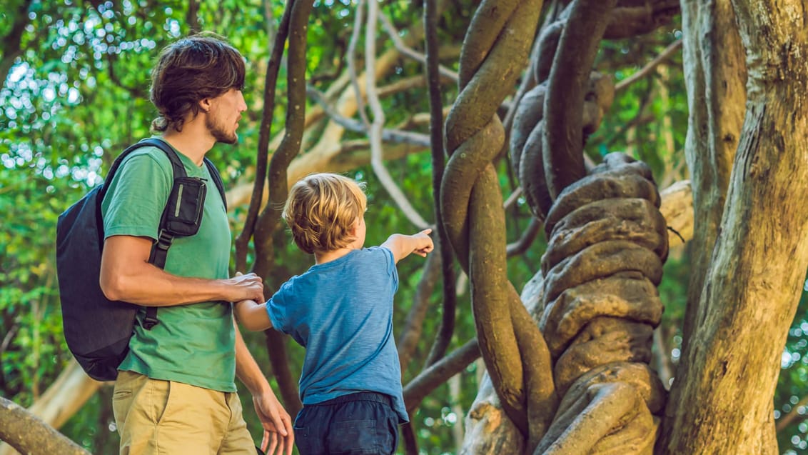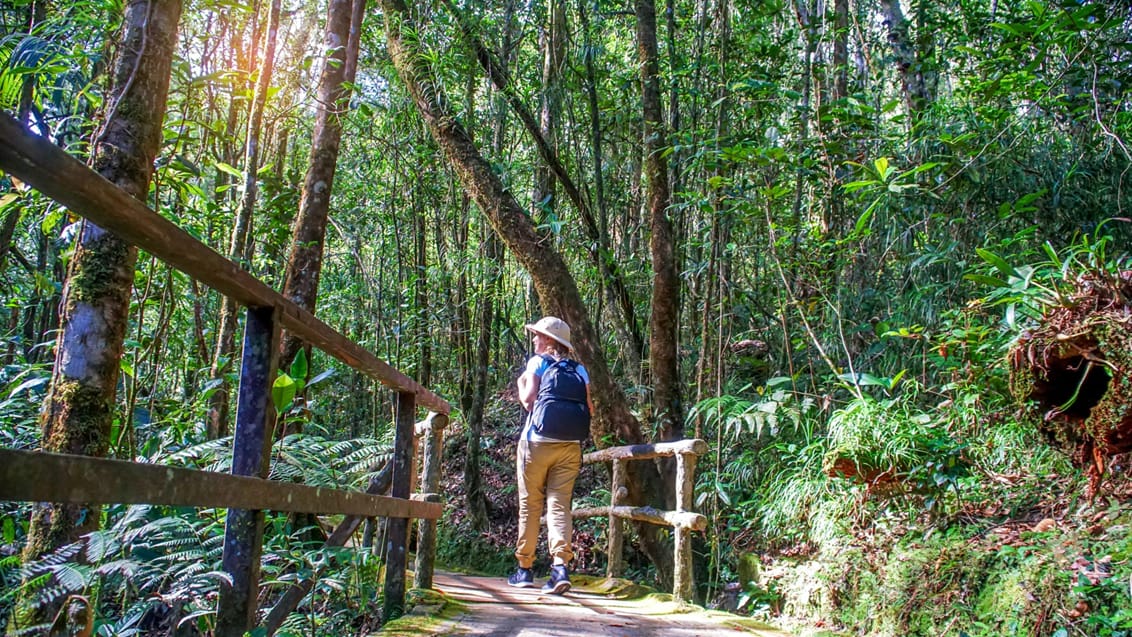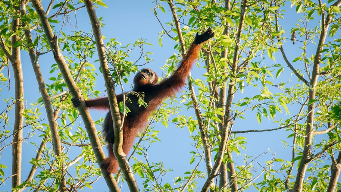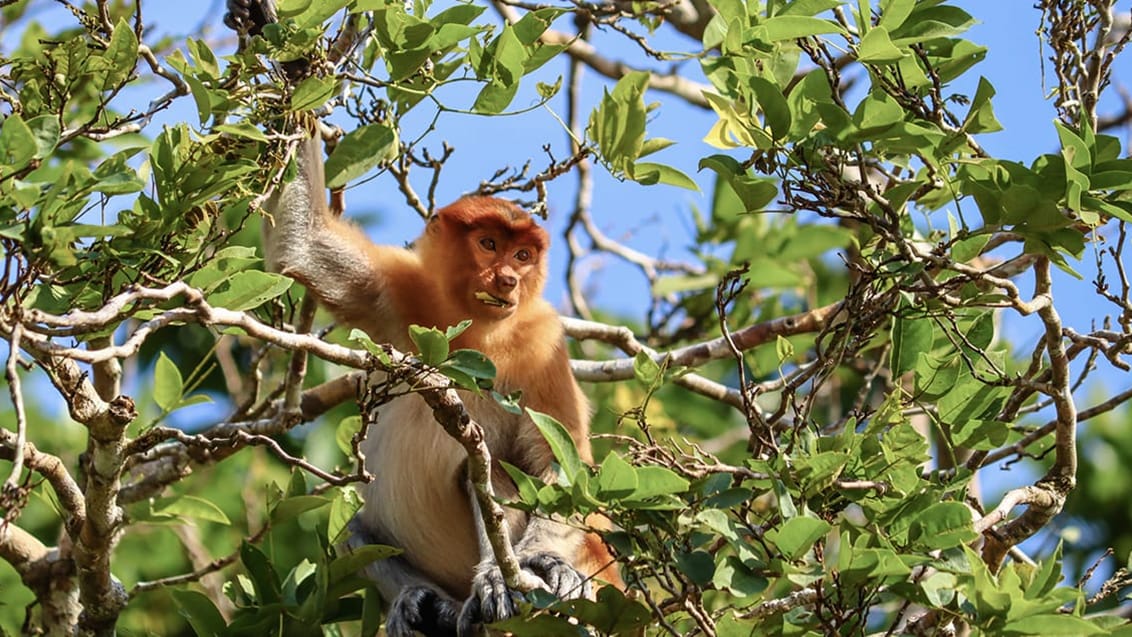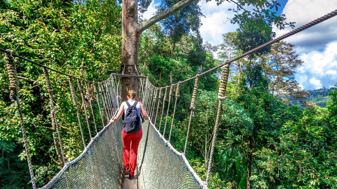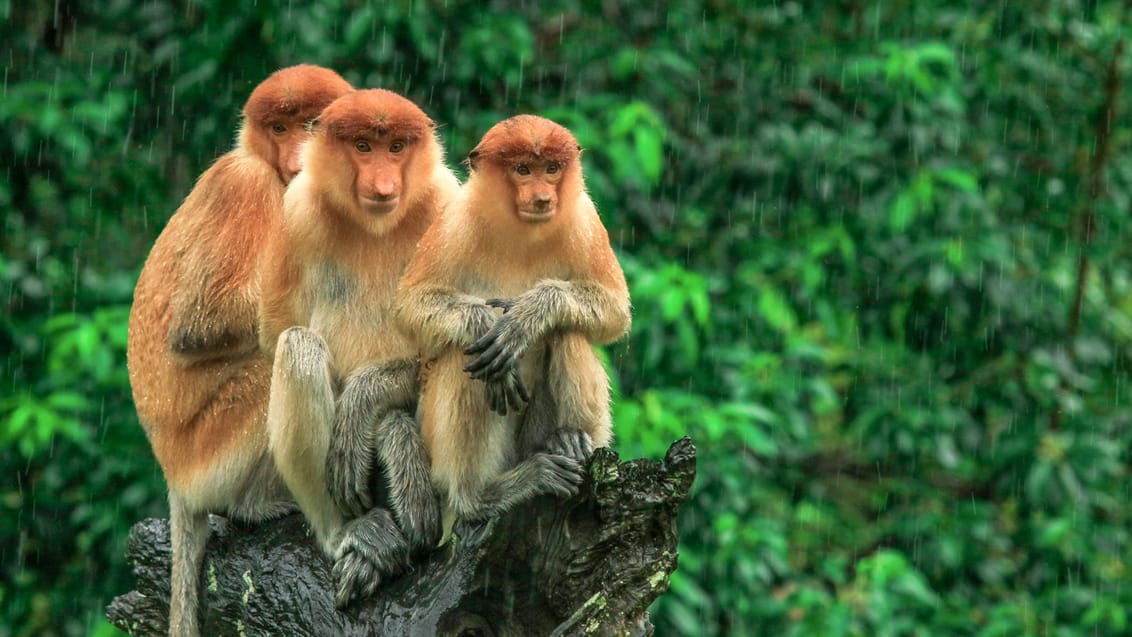 Från fastlandet flyger du vidare till Borneo – starten på ett oförglömligt naturäventyr. Här väntar en nattvandring i djungeln, flodtur i solnedgången och möten med det rika djurlivet, bland annat näsapor och färgstarka fåglar. Vid ett besök på ett orangutang-rehabiliteringscenter får du uppleva de fascinerande djuren på nära håll. Resan bjuder även på avkoppling vid varma källor och en promenad högt uppe i djungelns trädtoppar på hängbroar.