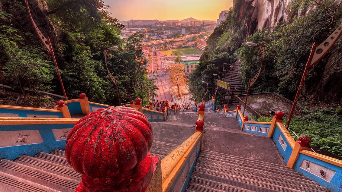 Från KL Central Station leder guiden dig vidare till tåget som tar er till Batu Caves. De mäktiga kalkstensgrottorna ligger i utkanten av staden och rymmer ett av Malaysias mest kända hindutempel. Turen avslutas med en promenad längs Jalan Masjid India – en av stadens mest färgsprakande och livliga gator, full av varor och doftande matstånd – innan du slår dig ner och njuter av en välförtjänt lunch. Du får möjlighet att prova ”Banana leaf food”, en av landets mest populära lunchrätter. Eftermiddagen och kvällen är på egen hand. (